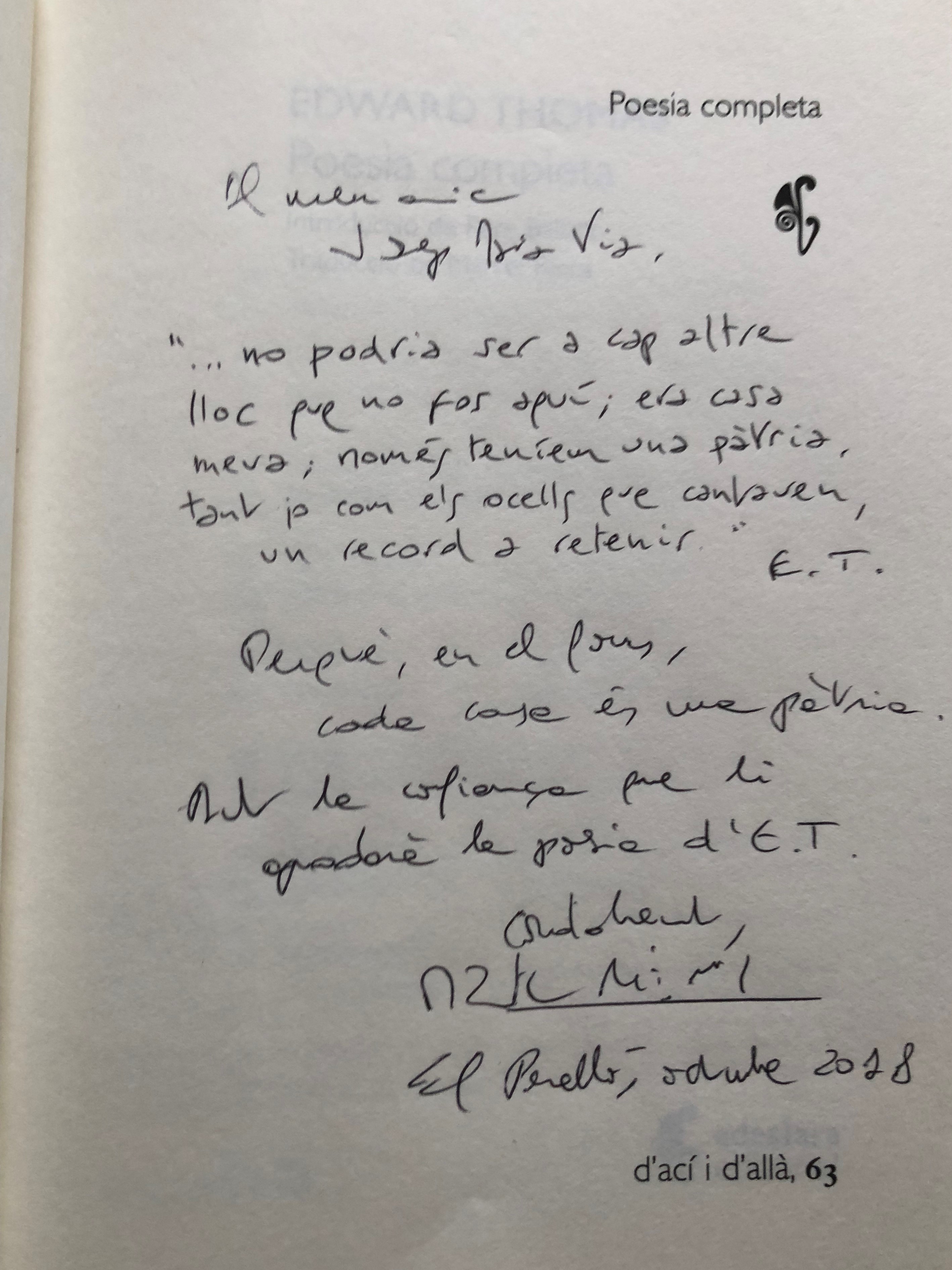 Dedicatòria exquisita del teu amic Marcel Riera,a El Perello,lloc on imagino tens la teva patria…