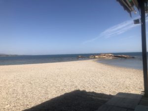 estaven enllestint, allargassant la conversa fins que un ha decidit anar a pagar. Les dues senyores -parlaven francès- gaudien lentament del cafè sense semblar tenir cap pressa. I és que hi havia motius per no tenir pressa. La guingueta està situada a escassos metres del mar, pràcticament davant d’un petit cap que entra al mar i separa la badia/cala en dues cales no gaire grans, maques i agradables. A l’hora de dinar el sol donava un to ocre a les roques del petit cap, platejat a les pedretes de la platja, i al fons el mar canviava de verd-blau transparent, cristal·lí, a blau cel per acabar sent blau marí fins a l’horitzó. He dinat tranquil·lament, sense cap pressa, embadalit amb el paisatge. Coincidint amb el que en diem primera hora de la tarda, a quarts de quatre, les quatre, ha vingut, d’una banda, un grup de tres noies que m’han semblat d’edat universitària i, d’una altra, un home sol, un home gran, atlètic, amb la pell morena del sol, d’un color bonic, que ha desplegat una cadira, s’hi ha assegut i, amb la mirada perduda a l’horitzó, ha acabat de fumar un petit puret que duia encès. A continuació s’ha submergit al mar i ha començat a nedar fins que costava veure-li el cap a la llunyania. Ha trigat en tornar però ha tornat, s’ha tornat a asseure a la cadira i ha encès un altre puret. Eren els banyistes de la tarda.