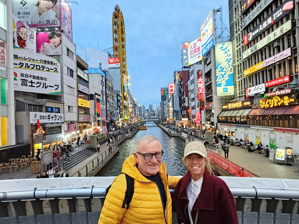 Com a bons turistes, visita al castell (impressionant!), passejada per les galeries Ebisubashi fins al riu, i recorregut pels ponts sobre Dotombori. Cartells lluminosos impactants (semblants i alhora diferents dels de Shibuya), amb el famós Glicoman presidint la façana. La seva fama es justifica per la història que l’acompanya i els anys que fa que hi és. Si no fos per això, podria passar per un més entre els molts que omplen la zona.