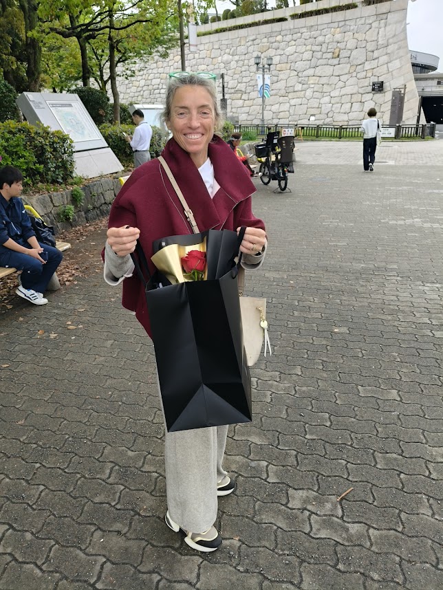 vam entrar. Ningú no parlava un borrall d’anglès. Amb una app de traducció al japonès, vam preguntar per què es deia Sant Jordi. Rient a la seva manera -una mica “alelada”, pocasolta, en el nostre codi- ens van dir que no en tenien ni idea. Es van mostrar encuriosits en saber que era el dia de Sant Jordi, i en explicar-los la tradició, ens van preparar una rosa preciosa, presentada amb una delicadesa exquisida. Quina meravella, fer un tastet de Sant Jordi al Japó.