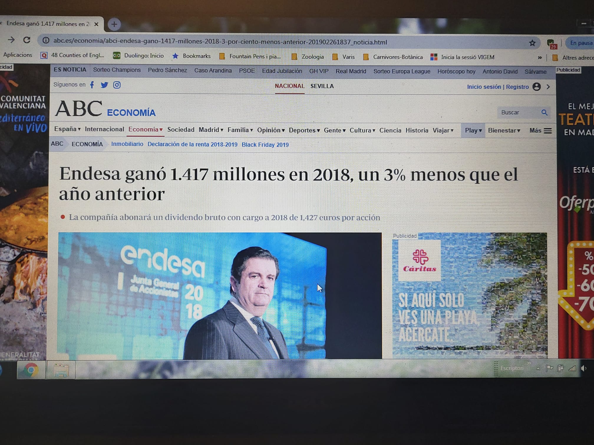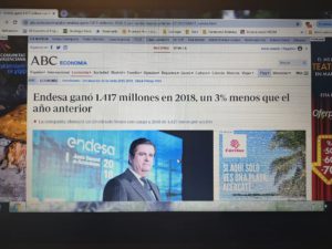 No sembla que el problema d’aquesta elèctrica sigui que no tenen recursos. Ja sé que són moltes les companyies que presenten resultats d’una manera o altra, i que sovint hi veuen una oportunitat de transmetre solvència a través de la premsa. Se també que darrera els números, la complexitat que hi ha és gran i que no es pot tractar amb lleugeresa. En qualsevol cas però, el 26 de febrer de 2019, ENDESA va exhibir uns guanys de 1.417 milions d’Euros corresponent a l’exercici 2018 (ABC digital, secció Economia). Com a mínim fa reflexionar…