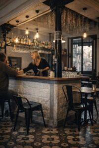 Tenia una barra en forma de U arrapada a la paret del fons, com una mena d’illa gran, domèstica i una mica solemne alhora. El terra em va fer pensar en moltes cases modernistes de Barcelona, amb aquell gust per una bellesa popular i decorativa que encara sabia conviure amb l’ús quotidià sense convertir-se en museu. Hi havia també unes columnes al mig del local, boniques, que el dotaven d’una certa noblesa, com si aquell establiment hagués conegut altres temps, o potser molts temps superposats, i en tots hagués sabut conservar alguna cosa de la seva dignitat.