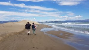 El paseo hasta la Punta del Fangar, hasta el faro, entre el mar y las dunas, permitió ratos de caminar a buen ritmo, momentos de paseo tranquilo, conversación seria ahora con uno, ahora con el otro, ratos de caminar y reírse en grupos de dos, de tres, recogida de conchas de moluscos, anécdotas, recuerdos y anhelos compartidos… De vuelta, cuando debían faltar unos veinte minutos para terminar la excursión vinieron a nuestro encuentro Joan y Anna. ¡¡¡Qué alegría!!!
