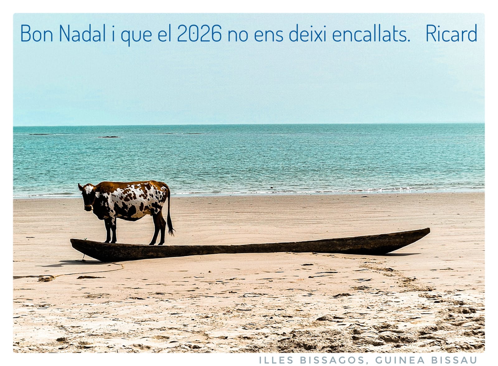 Mientras escribo, el amigo —también compañero de escuela y colega médico— Ricard Bargués, envía una felicitación mucho más realista. En ella se puede ver una vaca sobre una canoa o un tablón de madera clavado en la arena de una playa de Guinea-Bissau, y desea que “el 2026 no nos deje encallados”. Afortunadamente, también tengo amigos realistas, que ni tienen intereses personales para negar la evidencia, ni se engañan, ni engañan. ¡Es de agradecer!