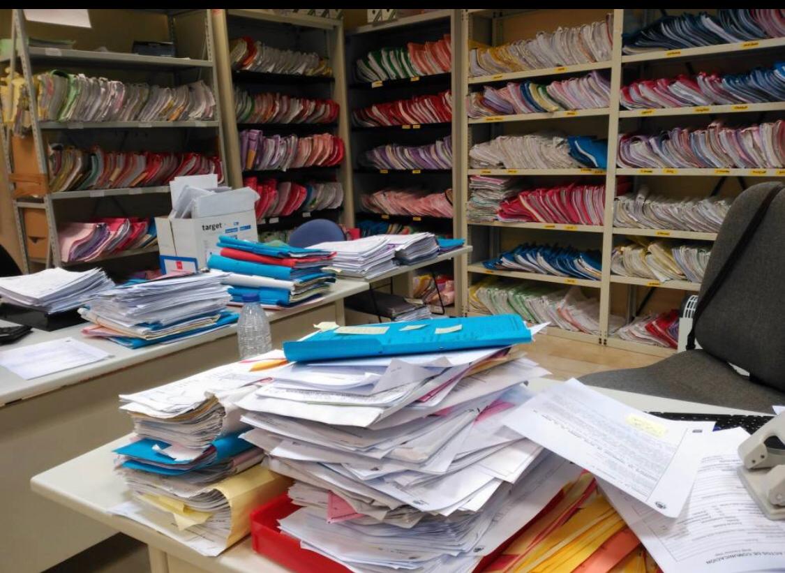Apareció la juez elegantemente vestida -contrastaba con la estética global del lugar y de los funcionarios- y mientras la funcionaria que nos pidió los DNI se disponía, sentada, a transcribir lo que dijéramos, la jueza, yo, el abogado de “la parte actora”, el procurador y el abogado-funcionario defensor de la Administración, por este orden, estábamos de pie, apilados como los propios expedientes, y colocados como podíamos entre mesas, sillas, armarios, estanterías y pilas de papeles por todas partes. Yo para ver al abogado-funcionario, tenía que sortear con la vista dos pilas de expedientes de al menos un metro de altura cada una de ellas.